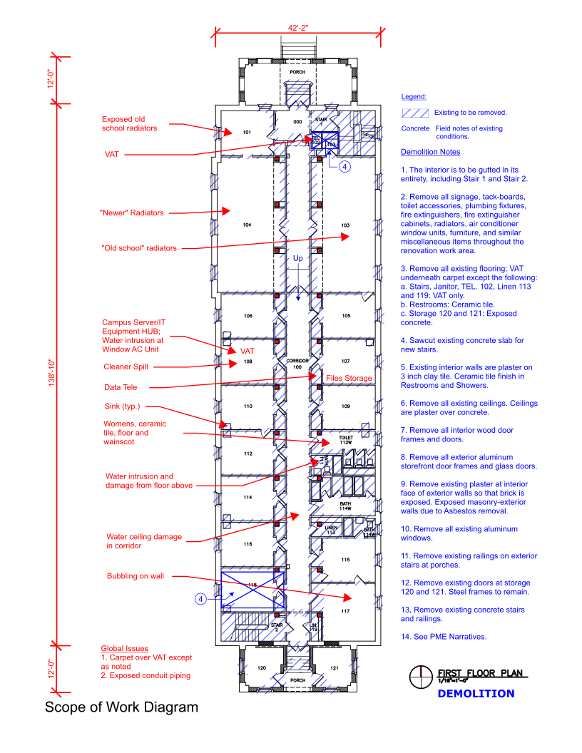 The project was an Existing Conditions Assessment and Renovation Study for Site, Architectural, PME/FP systems, and Code Compliance. The Final Report included a detailed Cost Estimate for full renovation that included Exterior Envelope Remediations, Elevator Addition, Interior Upfit and PME/FP and IT systems for future Administrative Use. The Building’s original use was a Dormitory.